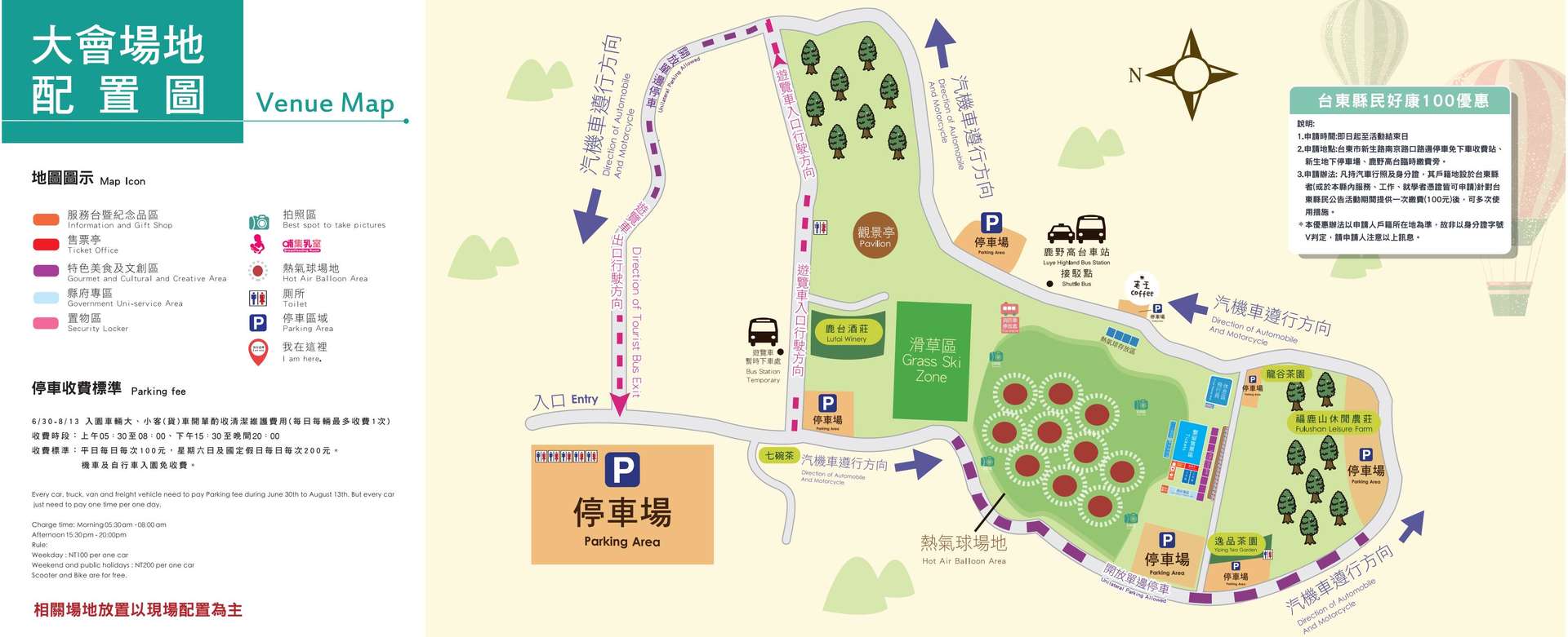 為方便縱谷區民眾申辦,活動開始日起(6月30日)亦可在活動現場鹿野高台收費票亭辦理(車籍不限設籍於台東,租賃車及營業車輛不適用)。