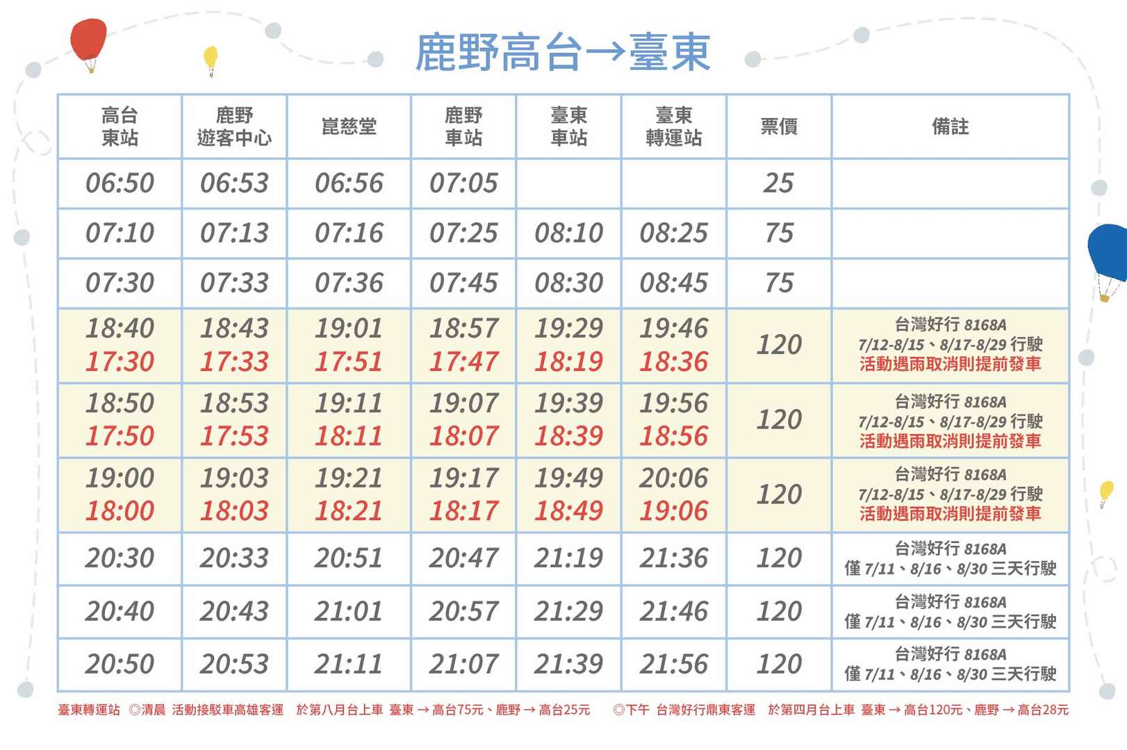 熱氣球期間(7/11-8/30)天天都有加開班次唷😁