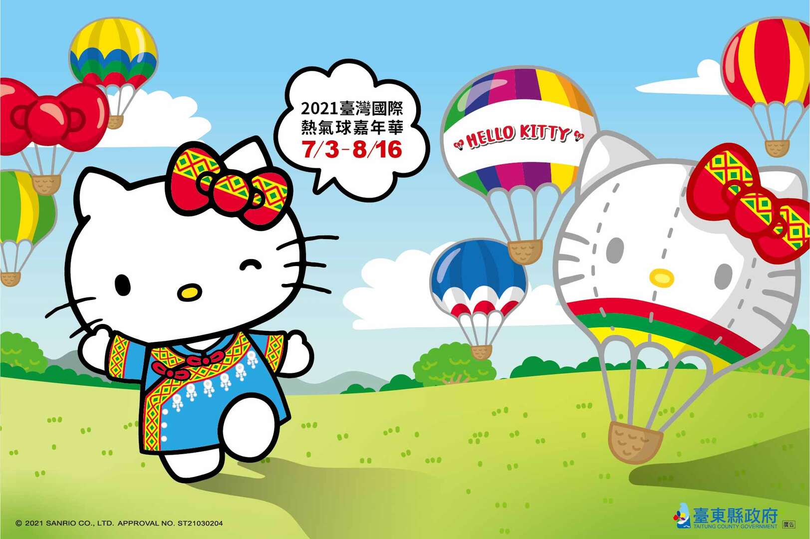 臺東縣政府表示,臺東縣擁有七大原住民族群,是全臺之最。在這當中,熱氣球主要的活動場域縱谷地區多為阿美族及布農族,而交通部觀光局的「喔熊」造型熱氣球穿著的是阿美族的傳統服飾,於是縣府便邀請「HELLO KITTY」穿著布農族傳統服飾來參加夏季最受矚目的「臺灣國際熱氣球嘉年華」。超高人氣的HELLO KITTY擁有全球無數鐵粉,此次「HELLO KITTY 熱氣球」不僅是全球唯一更是臺東限定,KITTY迷朝聖的唯一地點就在臺東,可以預見今年暑假超萌的「HELLO KITTY熱氣球」將激發旅客少女心,讓鹿野高台化身少女遊樂園!