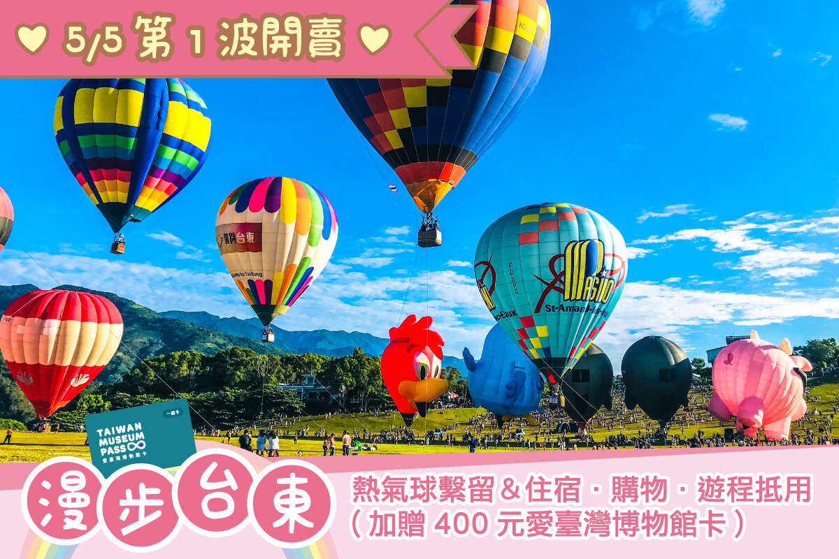 「2021臺灣國際熱氣球嘉年華線上繫留體驗預約套票」是結合台東各項旅遊服務,如旅宿、伴手禮、在地體驗等推出的「體驗套票」,將別於5/5中午12點開賣「漫步台東套票」售價3,000元起、5/19中午12點開賣「輕旅滿足套票」售價1,750元起、6/2中午12點開賣「歡樂升空套票」售價550元起。預購「漫步台東套票」更加碼贈送親子界超夯的育兒神卡「愛台灣博物館卡」(市價400元)寓教於樂,讓學童搭完熱氣球還可以憑博物館卡無限次數免費暢遊全台19個熱門博物館園區。