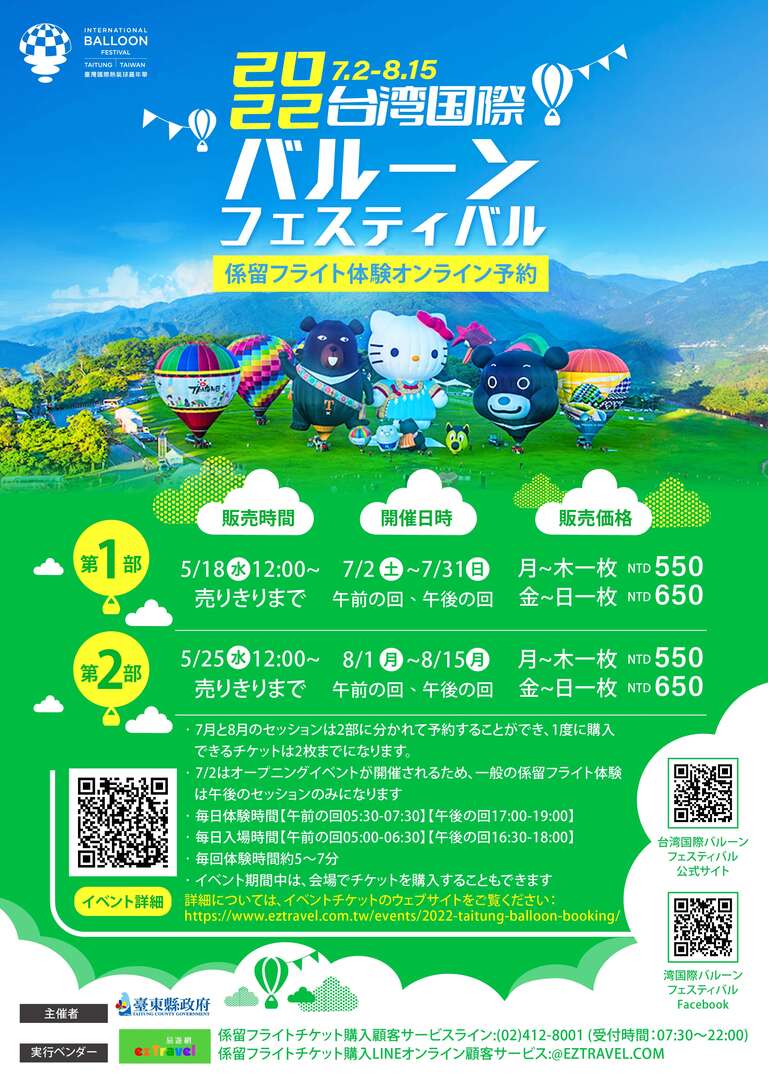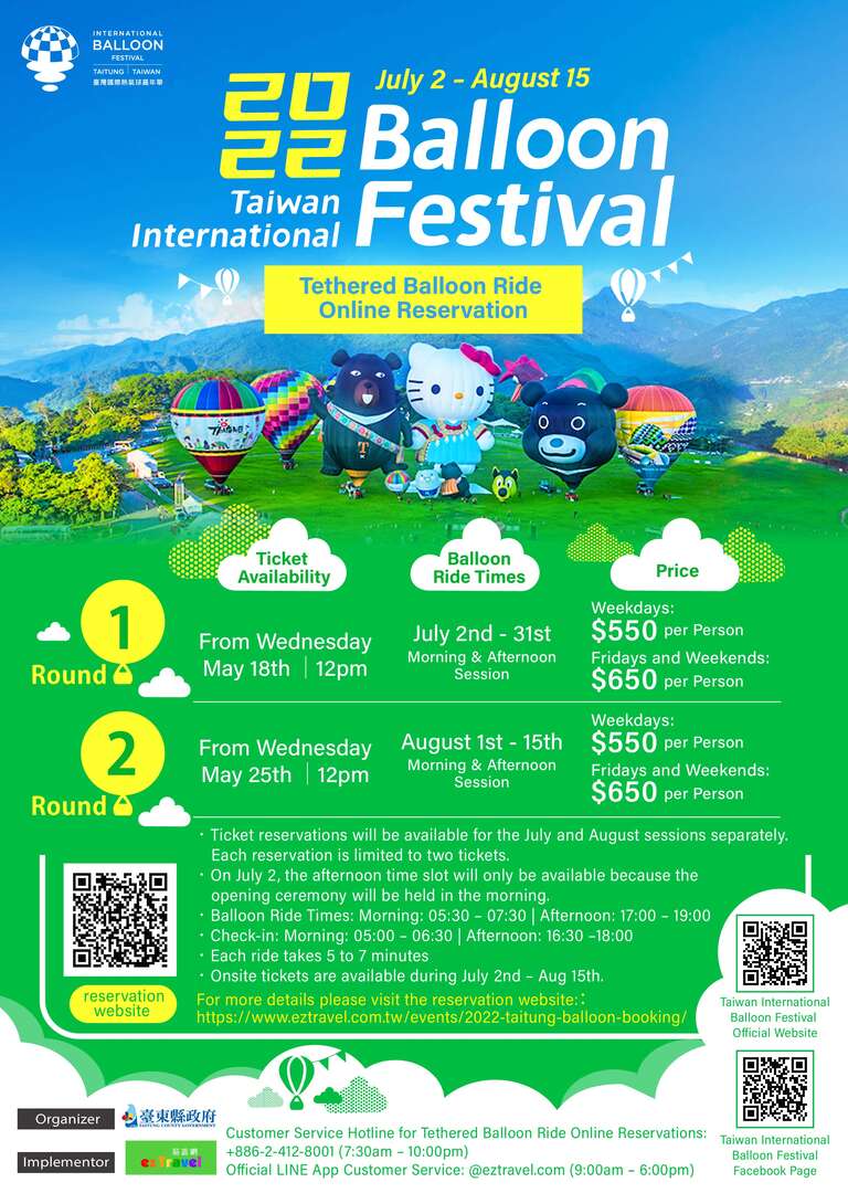 臺東縣政府表示,2022臺灣國際熱氣球嘉年華「熱氣球繫留體驗」將提供上午場(5:30-7:30)與下午場(17:00-19:00)兩個時段,球迷可於現場購票或線上預約方式,線上預約將委託易遊網系統販售,分兩階段開放民眾預購。第一階段於5月18日(三)中午12點開放預約7月2至7月31日場次,因7月2日配合開幕活動,僅供下午場預約。第二階段則於5月25日(三)中午12點開放預約8月1日至8月15日場次。票價部分,週一至週四平日為550元,週五至週日以及國定假日則為650元。今年總計有89個場次,共7,120位名額,每張體驗券為單人單場使用,若無法在線上購票的遊客,主辦單位也保留有現場購票的機會。