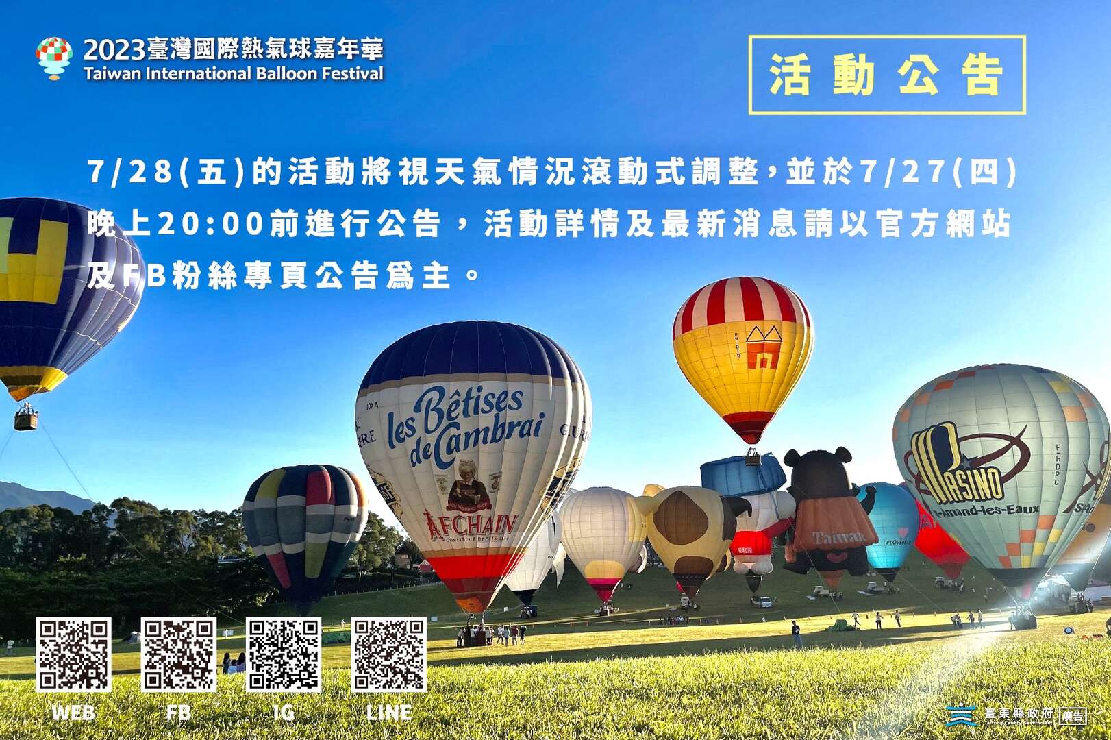 還想看熱氣球的球迷朋友們別失望!待杜蘇芮颱風遠離後「2023臺灣國際熱氣球嘉年華」將立即回復場地,除繫留體驗外,現場還有可愛的造型球展演、熱氣球美食及玩樂市集,有關熱氣球活動最新公告及資訊,請查詢關注臺灣國際熱氣球嘉年華的粉絲專頁及官網以取得最新消息。