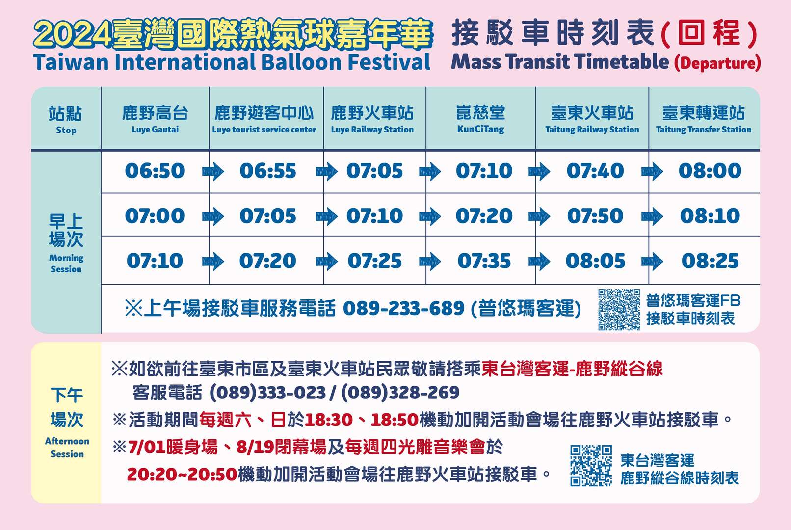 🚨【僅上午場】有去程及回程接駁服務,下午場請搭乘東台灣客運(台灣好行-鹿野縱谷線)