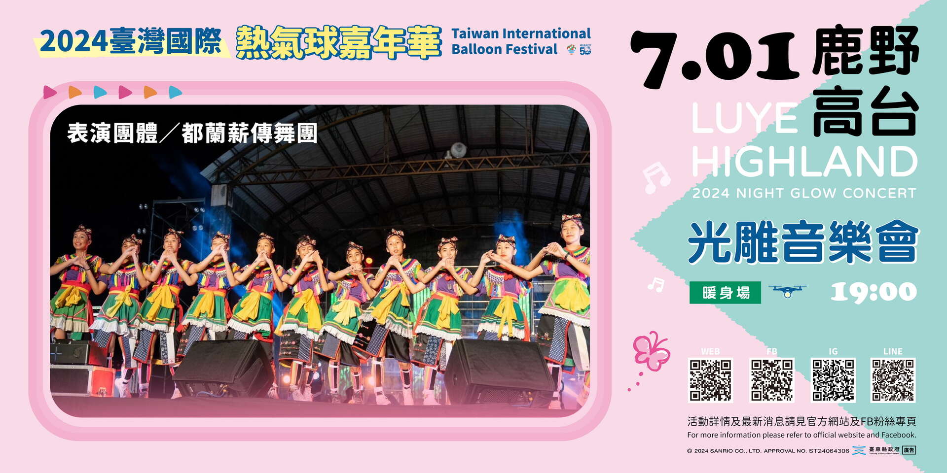 臺東縣政府表示,今年首次以暖身場熱氣球光雕音樂會方式登場,其中民眾詢問度最高的熱氣球光雕聯合無人機展演將搶先曝光,當天由超高人氣HELLO KITTY熱氣球與台東天后宮媽祖球帶領福利熊與愛心球等7顆熱氣球擔綱演出,三麗鷗家族角色「HELLO KITTY、布丁狗、美樂蒂、酷企鵝及大耳狗喜拿」等,也加入500架次無人機展演陣容。同時更將推出全國首見「無人機QRcode條碼」,在鹿野高台上空以無人機形成一個可掃描QRcode條碼,民眾用手機掃描後,有機會獲得官方限定版熱氣球小球。