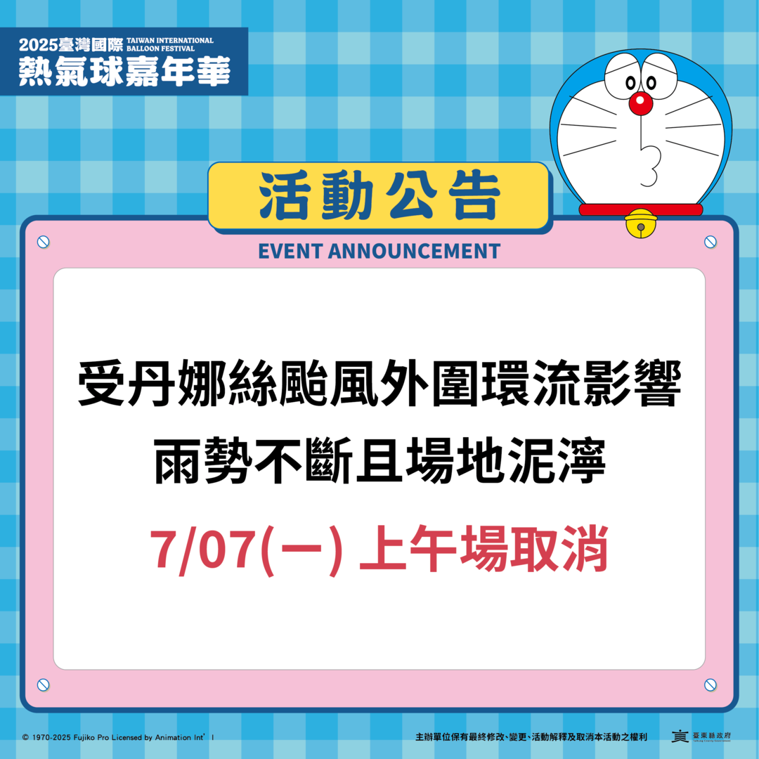 受丹娜絲颱風外圍環流影響,雨勢不斷且場地泥濘,經熱氣球專業飛行團隊審慎評估後,取消7/7(一)上午場活動