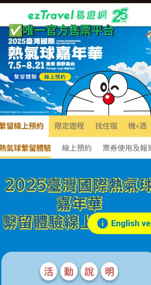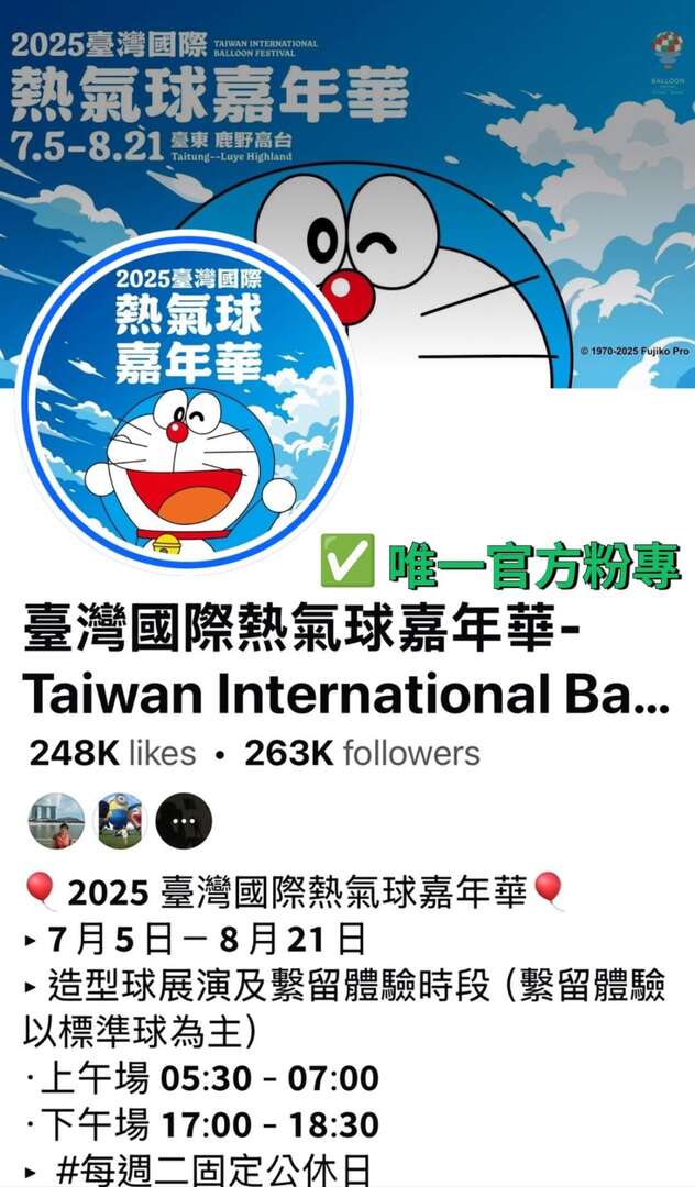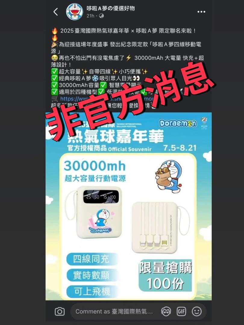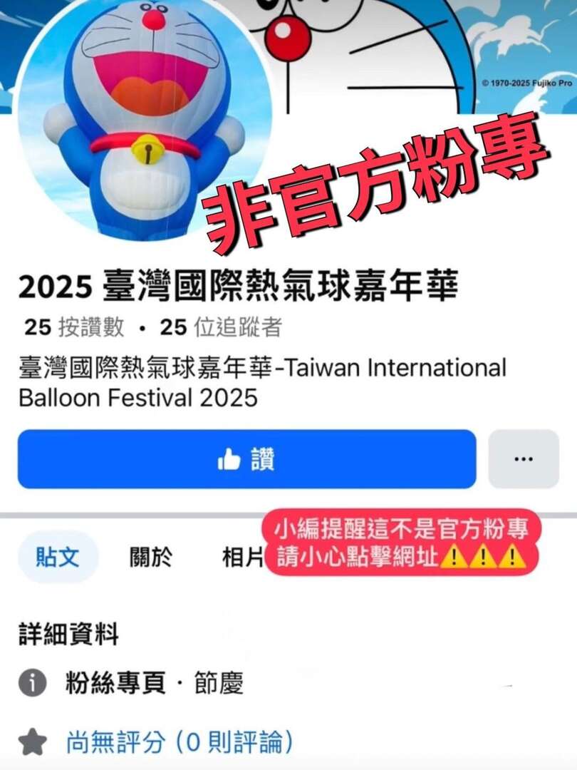 臺東縣政府主辦「2025臺灣國際熱氣球嘉年華」,自7月5日起在鹿野高台盛大展開,今年首次與哆啦A夢IP合作的限量造型熱氣球人氣夯,開幕日即吸引逾3萬名遊客,但近期出現許多疑似詐騙網站,要求民眾加入LINE會員,縣府提醒民眾千萬不要輕易提供個資,目前並未透過任何網路平台銷售哆啦A夢官方商品,或提供搭乘熱氣球優惠。縣府說明並重申,目前「臺灣國際熱氣球嘉年華-Taiwan International Balloon Festival」為唯一官方臉書,追蹤人數已高達26萬人,請民眾多加注意。