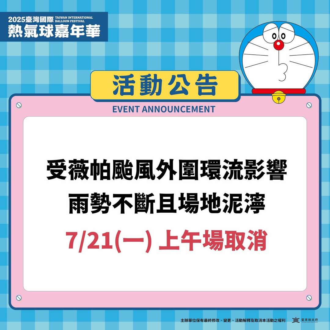 受薇帕颱風外圍環流影響,經熱氣球專業飛行團隊審慎評估後,取消7/21(一)上午場活動。