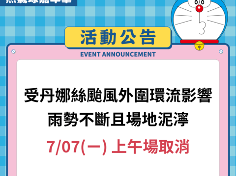 受丹娜絲颱風外圍環流影響 7/7(一)上午場活動取消