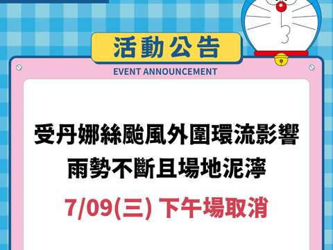 受丹娜絲颱風外圍環流影響 7/9(三)下午場活動取消