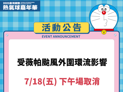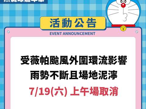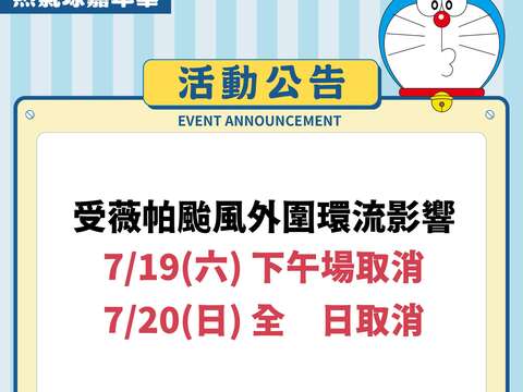 受薇帕颱風外圍環流影響,取消7/19(六)下午場、7/20(日)全日活動